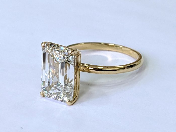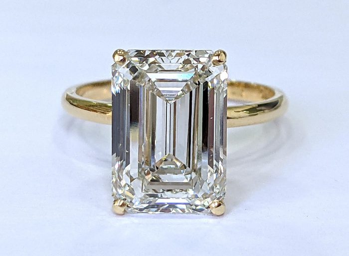 Flot diamantring, 18 kt guld, prydet med stor smaragdsleben diamant på 5,10 ct. Klarhed: VS1. Farve: TOP WESSELTON (F). 3 x excellent. Diamant måler 11,57 x 8,24 x 5,50 mm. Ringstørrelse 55. Leveres i smykkeetui. Medfølgende certifikat fra verdens største ædelstenslaboratorium IGI. Laser inskription på rondisten.